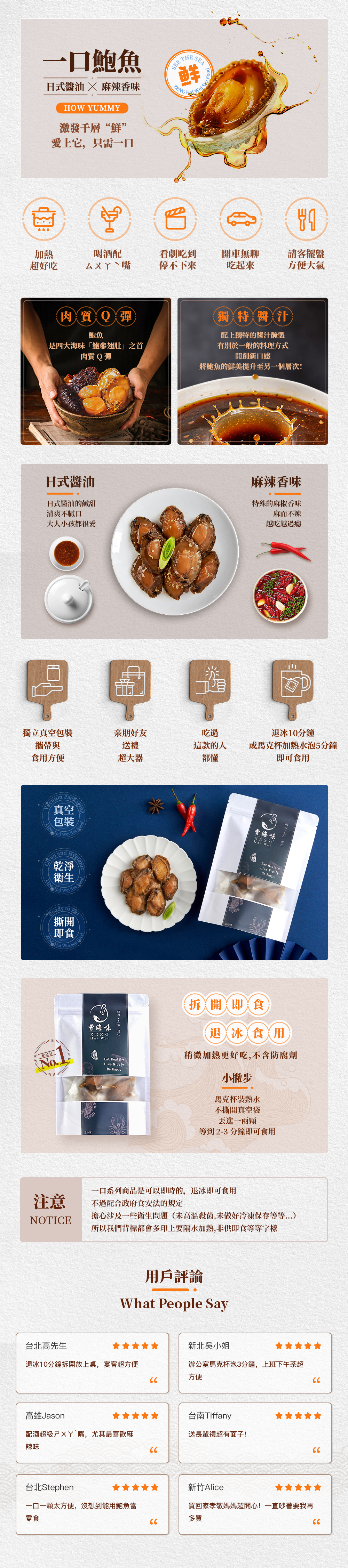 鮮鮑魚配上獨特的醬汁醃製有別於一般的料理方式,開創新口感將鮑魚的鮮美提升至另一個層次!